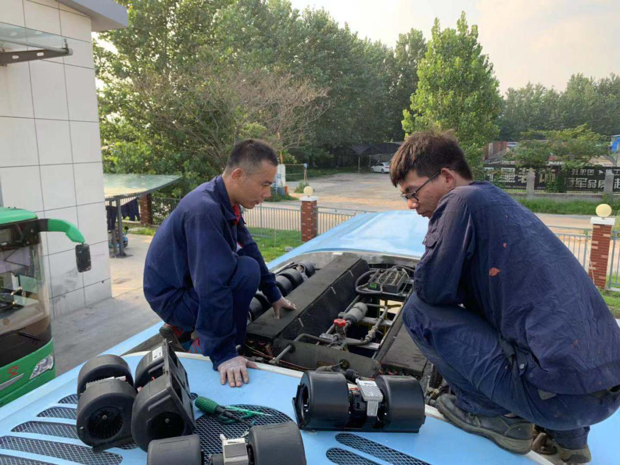 热天公交车空调维修也多了起来,在北京路公交停保场,记者看到修理车间主任魏坤正在一辆公交车车顶与工友探讨排除故障。