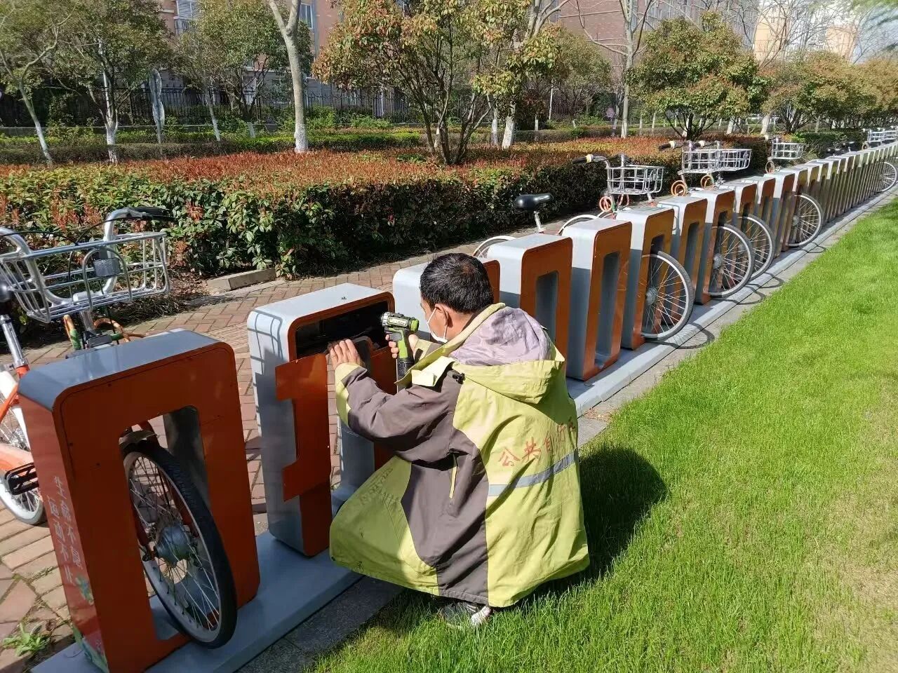 工作人员在擦拭锁桩和公共自行车