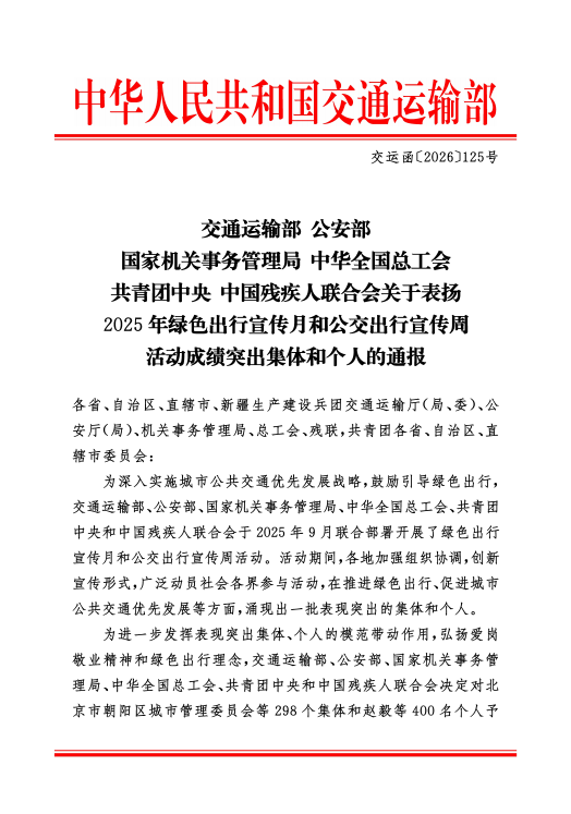 近日,交通运输部、公安部、国家机关事务管理局、中华全国总工会、共青团中央、中国残疾人联合会联合发布通报,对2025年度绿色出行宣传月和公交出行宣传周活动中表现优异的集体予以表彰。公交公司凭借在推广绿色出行、提升服务品质、推进低碳交通建设等方面的突出成效,获评“成绩突出集体”荣誉称号。