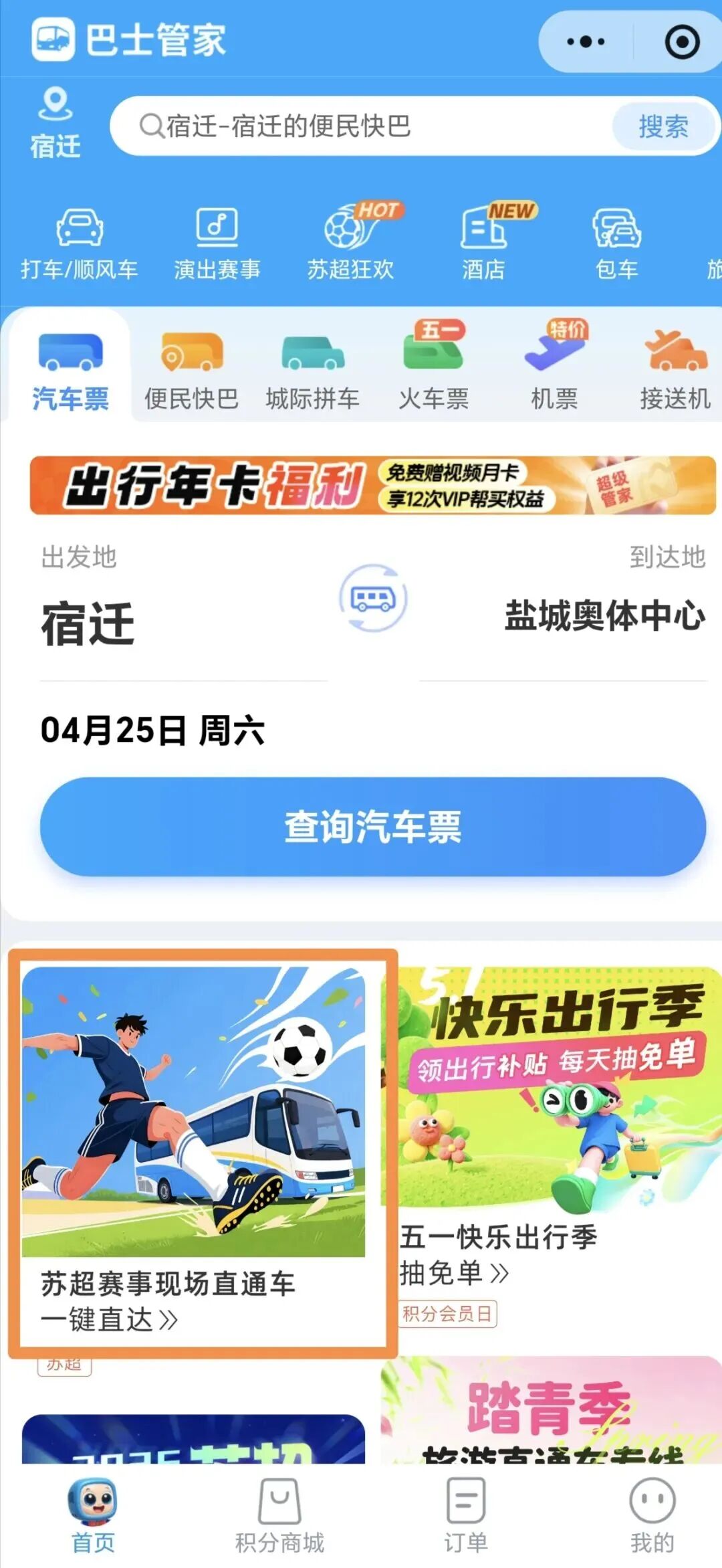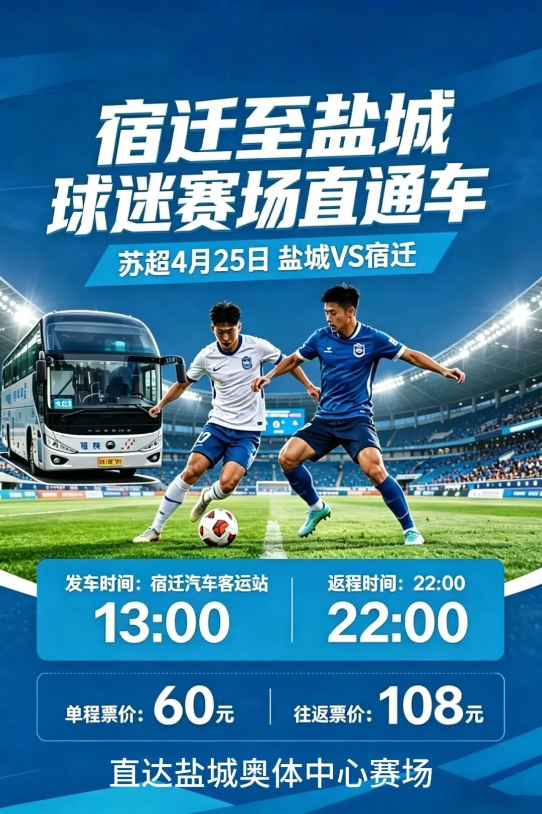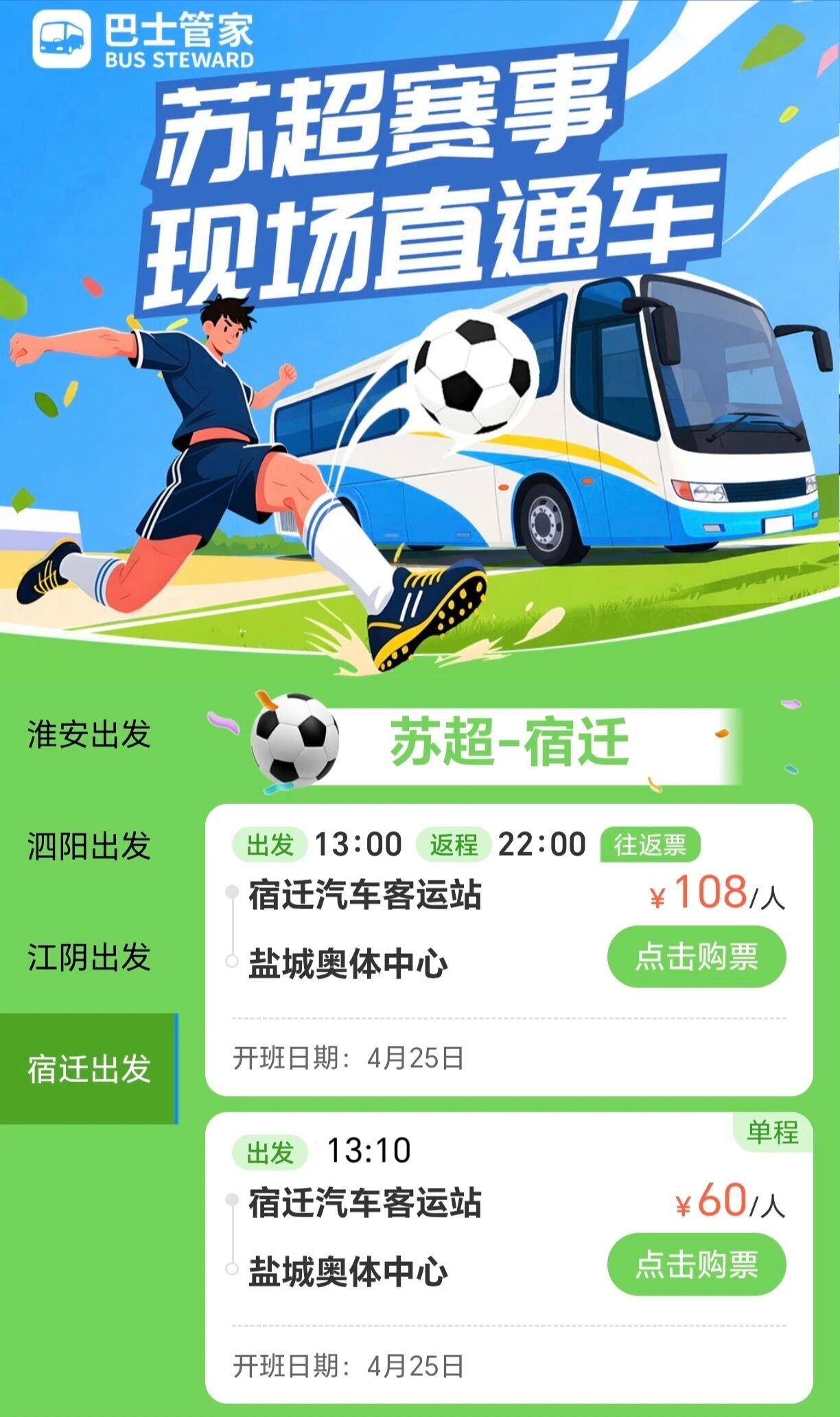 【宿汽集团】苏超宿迁至盐城 球迷赛事直通车开通啦!4月25日盐城队VS宿迁队 宿迁汽车站邀您一起去呐喊!