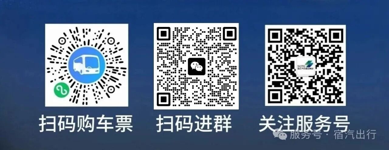 线上可通过扫码进入微信群或者搜索“巴士管家”小程序、宿汽出行公众号在线购票;