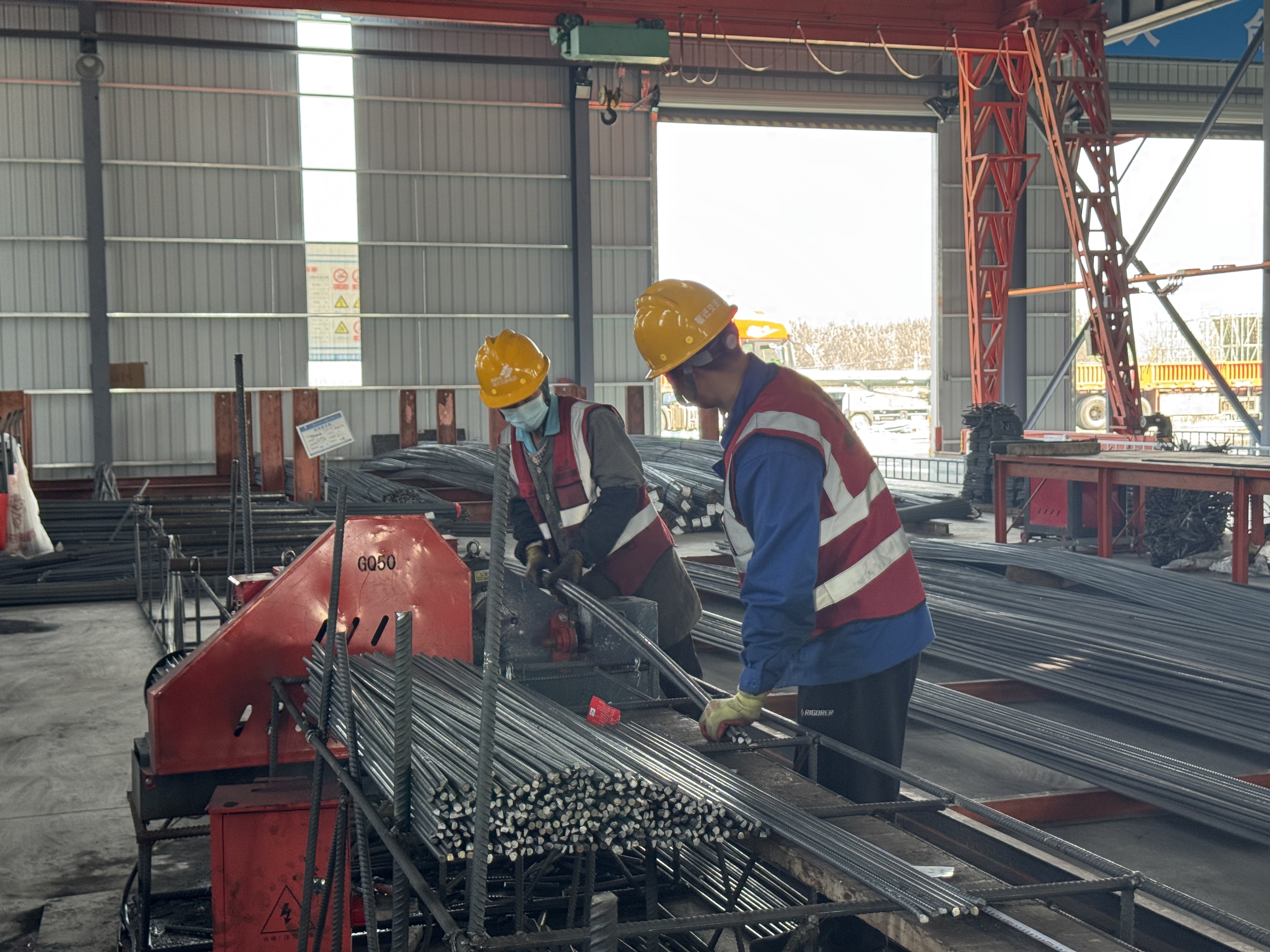 在施工现场钢筋集中加工配送中心,厂房内数控钢筋弯曲机、切断机等设备高效运转,工人们戴着安全帽、防护手套,在各自工位上有序作业。35岁的钢筋工王超正操作设备,将钢筋按设计尺寸精准弯折。“我主要负责钢筋半成品预制,每天早上6点到岗,根据生产任务单复核图纸、下料加工。现在项目全面推进,钢筋规格多、任务紧,我们班组分成白班、夜班两班倒,项目部也把后勤保障做得很到位,饮用水、药品、休息区一应俱全,让我们能安心干活。”他一边擦着额角的汗水,一边笑着说,“能参与宿迁最大的高铁枢纽建设,心里特别自豪,盼着高铁宿迁东站早日通车,以后出行更方便!”