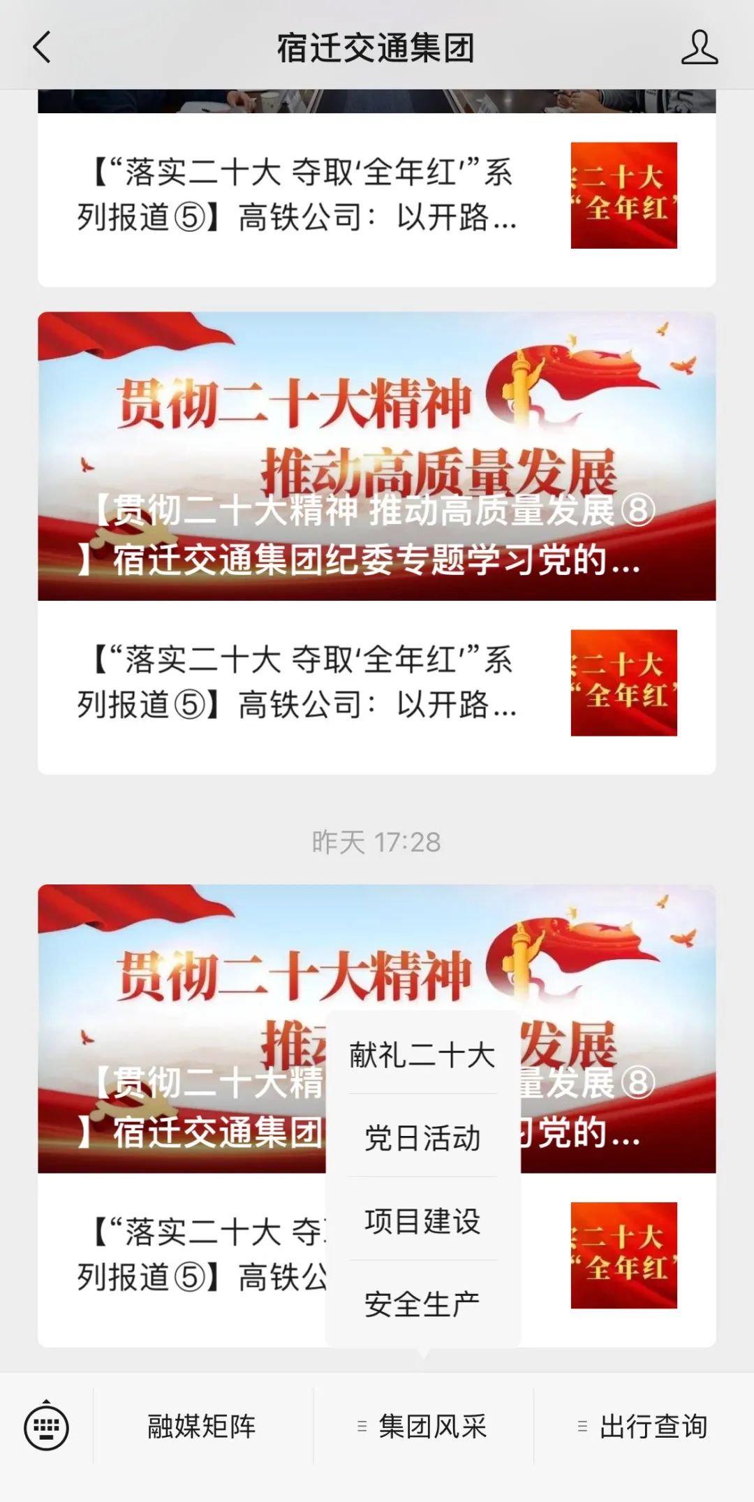 1.关注宿迁交通集团公众号,首页点击服务,在集团风采一栏找到“献礼二十大”。